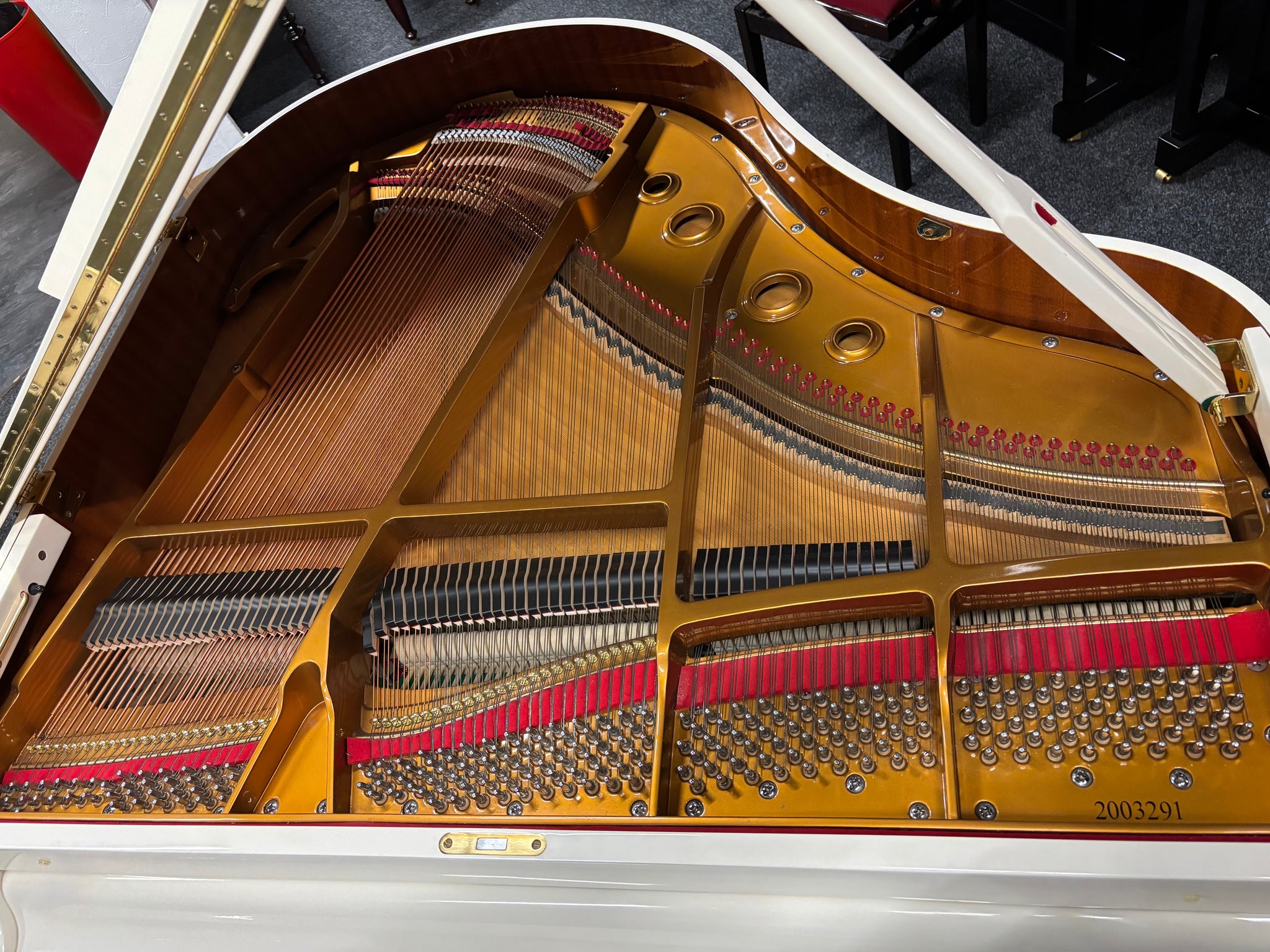 Finished in a striking ivory cabinet, this grand piano offers a refined and distinctive aesthetic that complements both classic and contemporary interiors. The piano is fitted with a soft-close fallboard, providing gentle, controlled closure over the keys for added safety and longevity, as well as a two-position lid prop to allow flexible control over sound projection.
